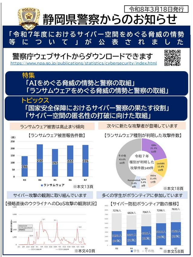 静岡県警察より「令和7年度におけるサーバー空間をめぐる脅威の情勢等について」が公表されました。